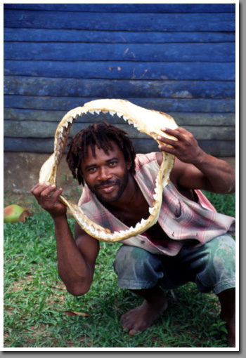 Caught two days earlier, meat already distributed in the village, the shark's jaws will adore his house wall.
