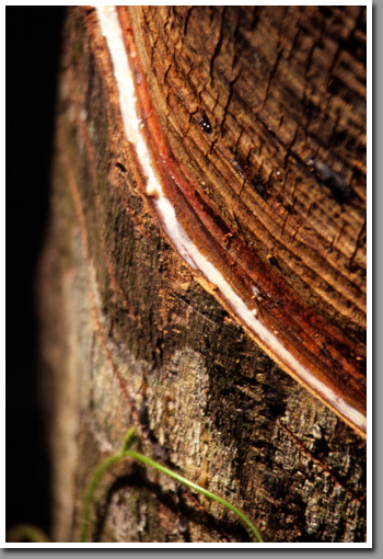 Milky sap flows down the cut to a collector mug from where it is taken for further processing to become latex and finally natural rubber.